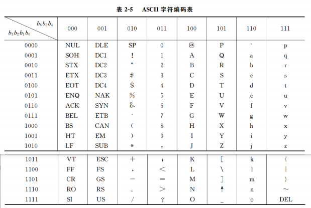 ASCII (American Standard Code for Information Interchange), 使用7位二进制表示一个字符, 计算机中一般使用一个字节来存放一个字符, 最左边一位可以作为奇偶校验位,用来检查错误,也可以用于西文字符和汉字的区分标识, 首位为0标志为西文字符.