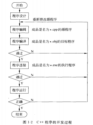 通过编辑器等手段将程序输入到计算机, 生成.cpp磁盘文件, 编译器进行编译转换为机器语言文件.obj, 再将多个目标文件与库文件等链接生成可执行文件, 然后运行/调试.
