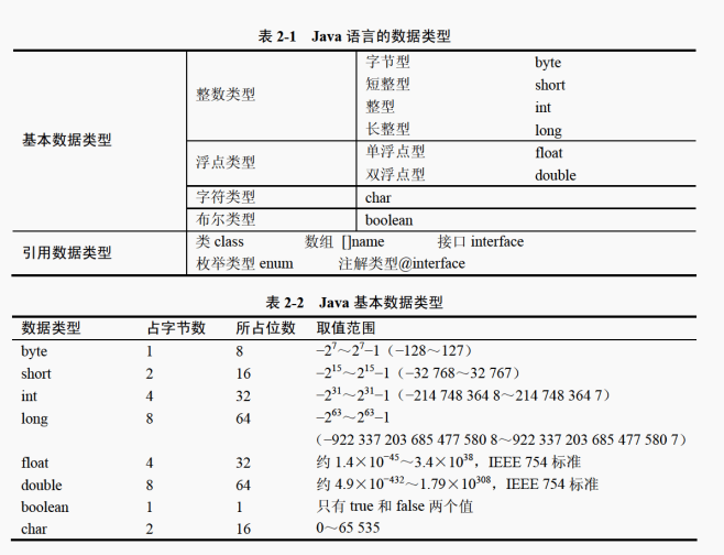 | 数据类型 | boolean、int、long、short、byte、float、double、char、class、interface、enum、void |