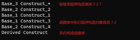 (1)调用基类构造函数,调用顺序按照它们被继承时声明的顺序(从左向右)。
