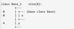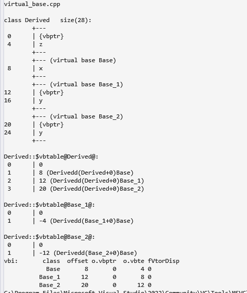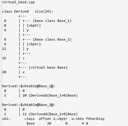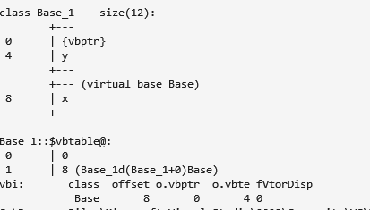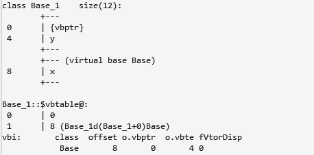 可以看到, Base_1, Base_2 都变成了虚基类, 本类中多了一个虚基类指针vbptr, 用来记录从Base_1, Base_2中虚继承下来的成员. 指向的虚基类表记录了三个虚基类的偏置值. 虚基类Base_1中 又记录了他的虚基类Base的的vbptr.