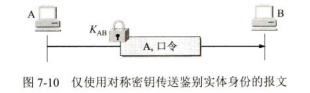 然而这种简单的鉴别方法具有明显的漏洞。例如,入侵者C可以从网络上截获A发给B的报文,C并不需要破译这个报文(因为破译可能很费时间),而是直接把这个由A加密的报文发送给B,使B误认为C就是A;然后B就向伪装成A的C发送许多本来应当发给A的报文。这就叫作重放攻击(replay attack)。C甚至还可以截获A的IP地址,然后把A的IP地址冒充为自己的IP地址(这叫作IP欺骗),使B更加容易受骗。