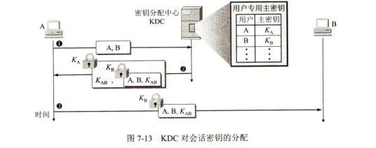 目前常用的密钥分配方式是设立密钥分配中心KDC(Key Distribution Center)。KDC是大家都信任的机构,其任务就是给需要进行秘密通信的用户临时分配一个会话密钥(仅使用一次)