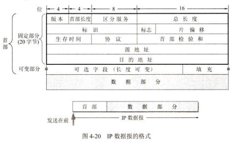 一个IP数据报由首部和数据两部分组成。首部的前一部分长度是固定的,共20字节,是所有IP数据报必须具有的。在首部的固定部分的后面是一些可选字段,其长度是可变的。
