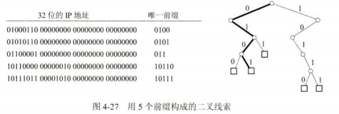 为了进行更加有效的查找,通常是把无分类编址的转发表存放在一种层次的数据结构中,然后自上而下地按层次进行查找。这里最常用的就是二叉线索(binary trie)",它是一种特殊结构的树。IP地址中从左到右的比特值决定了从根节点逐层向下层延伸的路径,而二叉线索中的各个路径就代表转发表中存放的各个地址。
