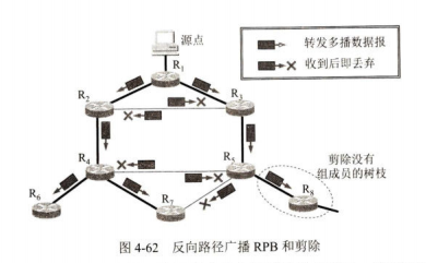在多播过程中一个多播组中的成员是动态变化的。例如在收听网上某个广播节目时,随时会有主机加入或离开这个多播组。多播路由选择实际上就是要找出以源主机为根节点的多播转发树。在多播转发树上,每一个多播路由器向树的叶节点方向转发收到的多播数据报,但在多播转发树上的路由器不会收到重复的多播数据报(即多播数据报不应在互联网中兜圈子)。不难看出,对不同的多播组对应于不同的多播转发树。同一个多播组,对不同的源点也会有不同的多播转发树。