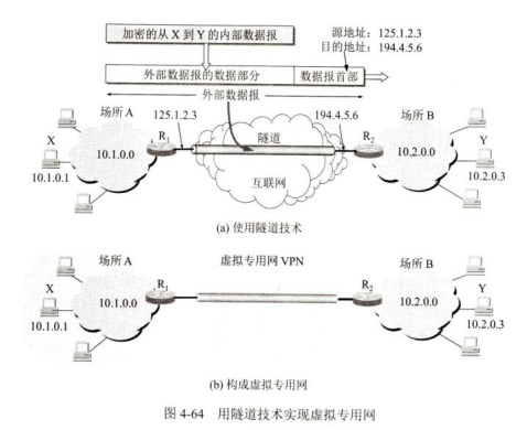 有时一个很大的机构的许多部门分布的范围很广(例如,在世界各地),这些部门经常要互相交换信息。这可以有两种方法。(1)租用电信公司的通信线路为本机构专用。这种方法虽然简单方便,但线路的租金太高,一般难于承受。(2)利用公用的互联网作为本机构各专用网之间的通信载体,这样的专用网又称为虚拟专用网VPN(Virtual Private Network)。