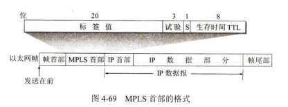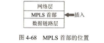 而IPv4数据报首部也没有多余的位置存放MPLS标签。这就需要使用一种封装技术:在把IP数据报封装成以太网帧之前,先要插入一个MPLS首部。从层次的角度看,MPLS首部就处在第二层和第三层之间(如图4-68所示)。在把加上MPLS首部的IP数据报封装成以太网帧时,以以太网的类型字段在单播的情况下设置为8847_16(下标16表示这是十六进制的数字),而在多播的情况下为8848_16这样,接收方可以用帧的类型来判决这个帧是携带了MPLS标签还是一个常规的IP数据报