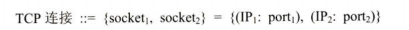每一条TCP连接有两个端点。那么,TCP连接的端点是什么呢?不是主机,不是主机的IP地址,不是应用进程,也不是运输层的协议端口。TCP连接的端点叫作套接字(socket)或插口。根据RFC 793的定义:端口号拼接到(concatenated with)IP地址即构成了套接字。因此,套接字的表示方法是在点分十进制的IP地址后面写上端口号,中间用冒号或逗号隔开