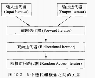 5个结构体全部定义在 头文件中,它们都不具有任何成员,只用来表示一个迭代器所属的分类。其中每个结构体对应于一种迭代器概念,迭代器之间的继承关系也与相应概念及其子概念之间的关系一致。