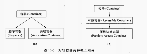 容器作为一种 STL 的概念,有许多子概念。容器分为顺序容器和关联容器,这就是容器的两个子概念,这种划分是基于容器中元素的组织方式的。另一方面,按照与容器所关联的迭代器类型划分,容器又具有"可逆容器"这一子概念,可逆容器又具有"随机访问容器"这一子概念