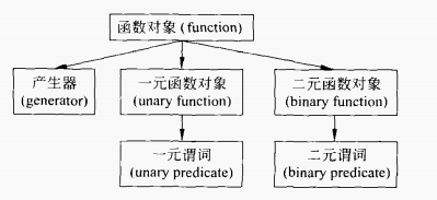 常用的函数对象可分为产生器 (generator) 、一元函数 (unary function) 、二元函数( binary function) 、一元谓词 (unary predicate) 和二元谓词 (binary predicate) 函数对象五大类。