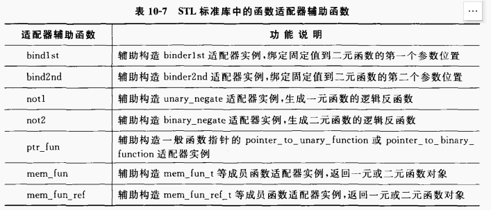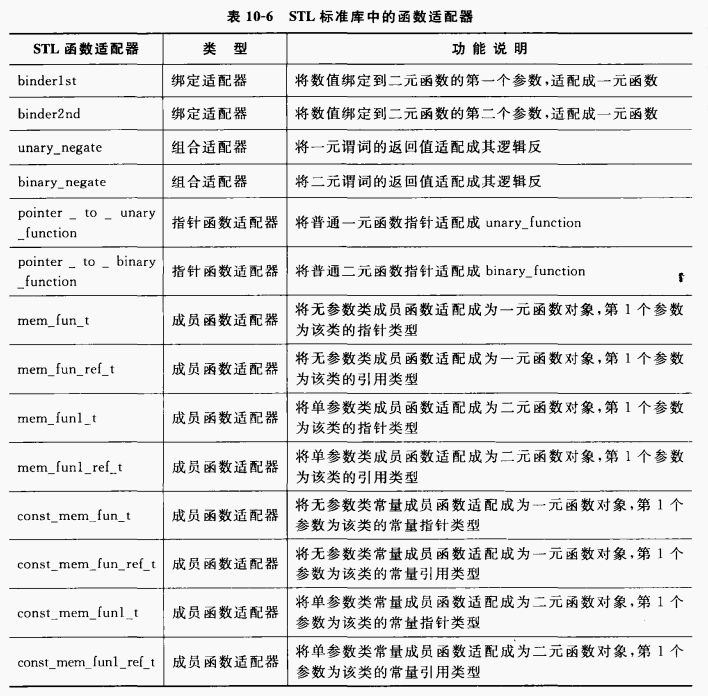 函数适配器实现了这一功能,将一种函数对象转化为另一种符合要求的函数对象。函数适配器可以分为4大类: 绑定适配器(bind adaptor) 、组合适配器 (composite adaptor) 、指针函数适配器 (pointer function adaptor) 和成员函数适配器 (member function adaptor)