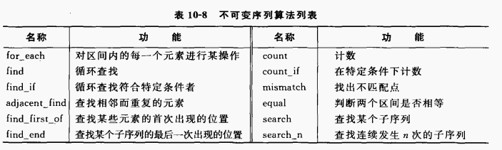 不可变序列算法 (non-mutating algorithms) 是指那些不直接修改所操作的容器内容的算法。