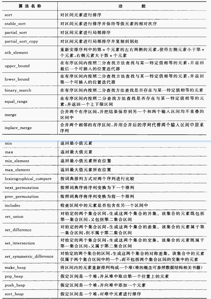 STL 包括 70 多个算法,这些算法覆盖了相当大的应用领域,其中包括查找算法、排序算法、消除算法、计数算法、比较算法、变换算法、置换算法和容器管理等。这些算法的一个最重要的特性就是它们的统一性,并且可以广泛用于不同的对象和内置的数据类型。