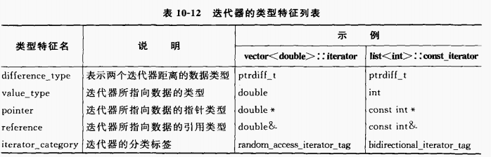 头文件中提供了一个作为助手的模板 iterator_tralts ,使用它可以以统一的方式得到包括指针在内的各种迭代器的类型特征。
