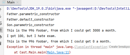 1 2 3 4 5 6 7 8 9 10 11 12 13 14 15 16 17 18 19 20 21 22 23 24 25 26 27 28 29 30 31 32 33 34 35 36 37 38 39 40 41 42 43 44 public class Father { public int salary; Father(int salary){ this .salary = salary; System.out.println("Father.parametric_constructor" ); } Father() { System.out.println("Father.default_constructor" ); this .salary = 0 ; } public void work () { System.out.println("This is the 996 foobar" + ", from which I could get " + salary + " a month." ); } } public class Son extends Father { public int score; public Son () { this .score = score; System.out.println("Son.default_constructor" ); } public Son (int score) { this .score = score; System.out.println("Son.parametric_constructor" ); }; public void doExam () { System.out.println("I got " + score + ", but I hate exam." ); } } public class Main { public static void main (String[] args) { Father f = new Father (3000 ); Son s = new Son (100 ); f.work(); s.doExam(); Father ff = s; ff.work(); Son ss = (Son)f; ss.doExam(); } }
