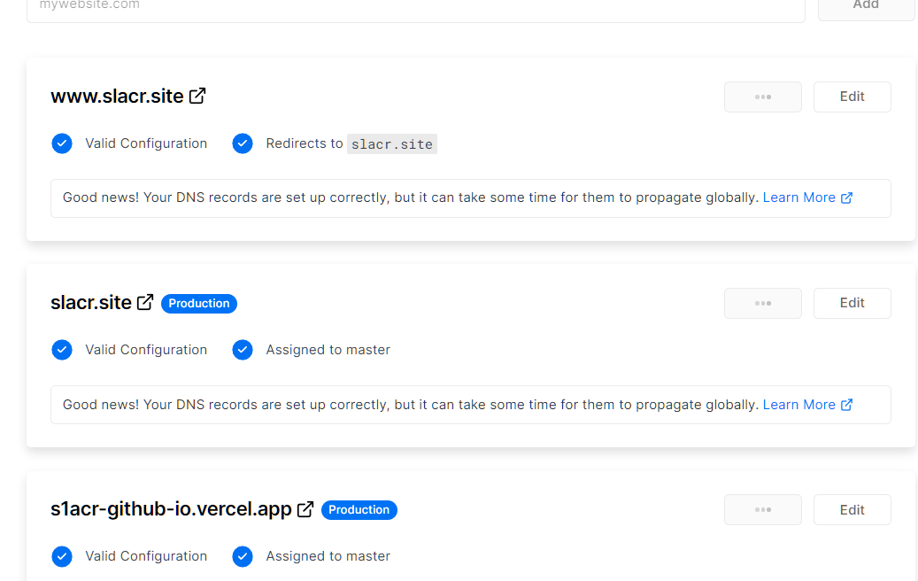 这样就能用自己的域名访问了, 对于其他的仓库我们也可以同样的配置域名, 添加二级三级域名等子域名也是可以的, 比如a.b.c.slacr.size
