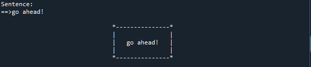 1 2 3 4 5 6 7 8 9 10 11 12 13 14 15 import osscreen_width = os.get_terminal_size().columns sentence = input ("Sentence:\n==>" ) padding = 3 box_width = len (sentence) + (padding+1 )*2 margin_left = (screen_width-box_width) >> 1 print ()print (" " *margin_left + "*" + "-" *(box_width-2 ) + "*" )print (" " *margin_left + "|" + " " *(box_width-2 ) + "|" )print (" " *margin_left + "|" + " " *padding + sentence + " " *padding + "|" )print (" " *margin_left + "|" + " " *(box_width-2 ) + "|" )print (" " *margin_left + "*" + "-" *(box_width-2 ) + "*" )