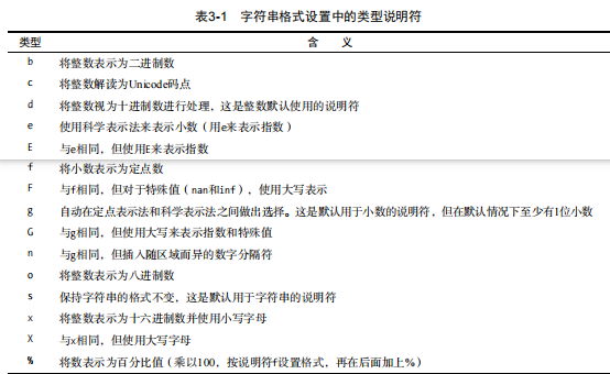 格式说明符:跟在冒号后面的表达式(这种表达式是使用微型格式指定语言表示的)。格式说明符让我们能够详细地指定最终的格式,包括格式类型(如字符串、浮点数或十六进制数),字段宽度和数的精度,如何显示符号和千位分隔符,以及各种对齐和填充方式。