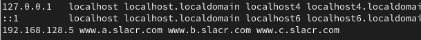当服务器无法为每个网站都分配一个独立IP地址的时候,可以尝试让Apache自动识别用户请求的域名,从而根据不同的域名请求来传输不同的内容。在这种情况下的配置更加简单,只需要保证位于生产环境中的服务器上有一个可用的IP地址就可以了。由于当前还没有介绍如何配置DNS解析服务,因此需要手工定义IP地址与域名之间的对应关系。/etc/hosts是Linux系统中用于强制把某个主机域名解析到指定IP地址的配置文件。