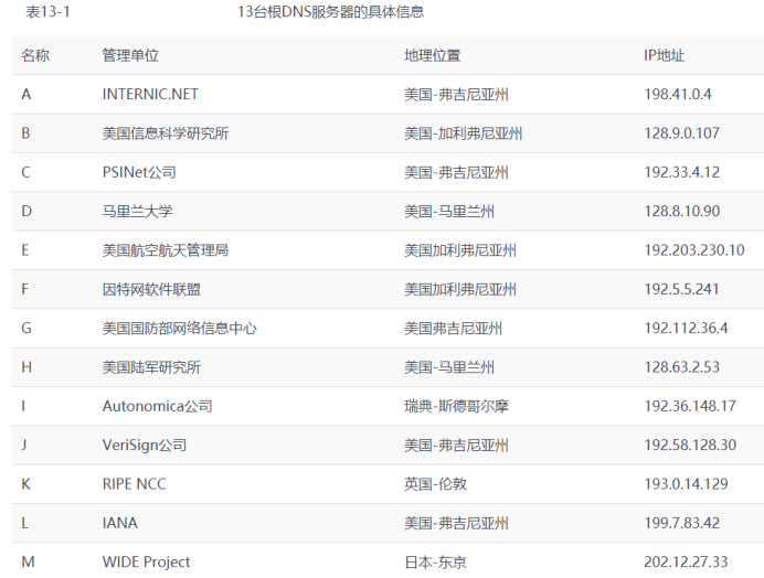 实际上用于根域名的服务器总共有504台,它们从A到M进行了排序,共用13个IP地址以此进行负载均衡,抵抗分布式拒绝服务攻击(DDoS)的影响。