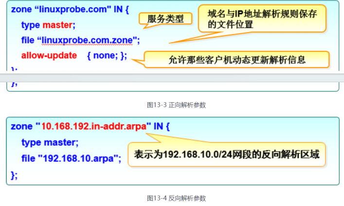 bind服务程序的区域配置文件(/etc/named.rfc1912.zones)用来保存域名和IP地址对应关系的所在位置。在这个文件中,定义了域名与IP地址解析规则保存的文件位置以及服务类型等内容,而没有包含具体的域名、IP地址对应关系等信息。服务类型有三种,分别为hint(根区域)、master(主区域)、slave(辅助区域),其中常用的master和slave指的就是主服务器和从服务器。