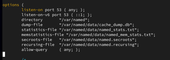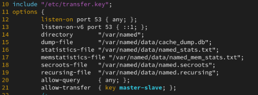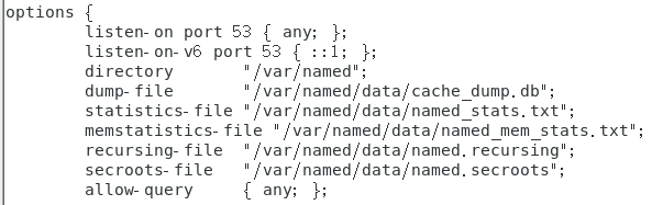 在Linux系统中,bind服务程序的名称为named。首先需要在/etc目录中找到该服务程序的主配置文件,然后把第11行和第19行的地址均修改为any,分别表示服务器上的所有IP地址均可提供DNS域名解析服务,以及允许所有人对本服务器发送DNS查询请求。