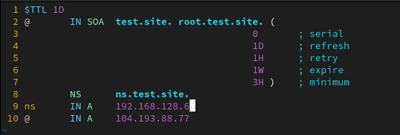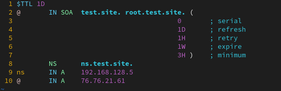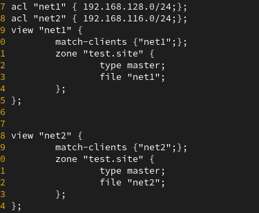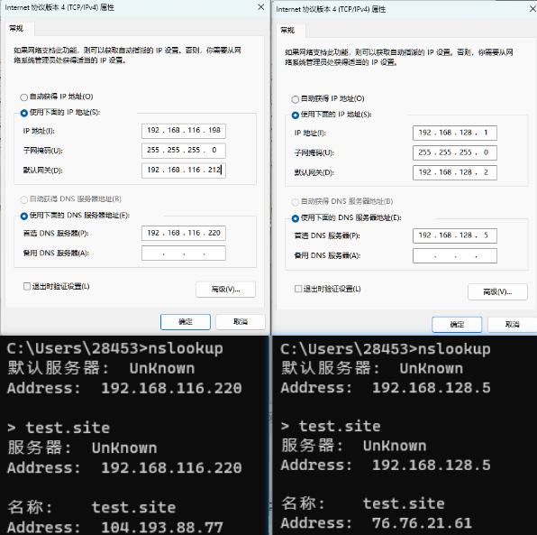配置NAT和桥接两张网卡, 来自内网(192.168.128.0/24)和外网(192.168.116.0/24)的DNS请求分别将 test.site 解析到 vercel(76.76.21.61) 和 baidu(104.193.88.77)