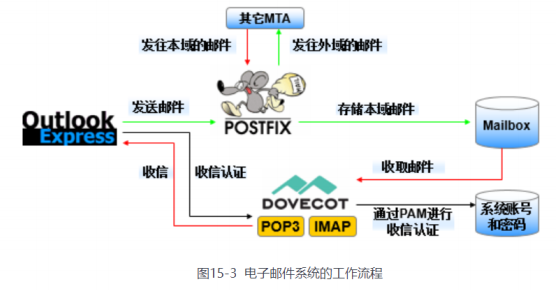 一个最基础的电子邮件系统要能提供发件服务和收件服务,为此需要使用基于SMTP协议的Postfix服务程序提供发件服务功能,并使用基于POP3协议的Dovecot服务程序提供收件服务功能。