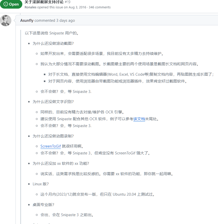 chrome 或者在console中输入 print() 能直接保存成PDF snipaste 本以为snipaste有长截图功能的, 毕竟随便一台安卓智能机都标配的功能, 可确实没有. 这16年的issue#19 还在… 可以使用 PixPin Author:slacr_Copyright:Published:December 10, 2023Updated:December 10, 2023Buy me a cup of coffee ☕.支