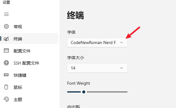 将终端字体改为NerdFonts 字体, 每种终端的设置不同。 在 windows 自带的 Terminal中,