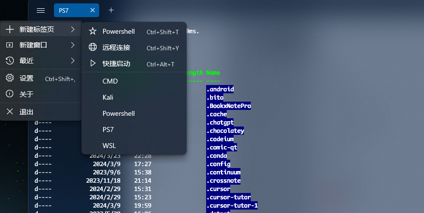 比如我这里添加Powershell7的终端连接 和 SSH 连Kali 虚拟机的连接