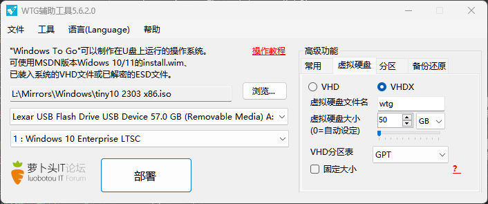 使用萝卜头论坛wtg工具, 准备一个U盘, 创建vhd/vhdx镜像, 烧录过程会格式化U盘