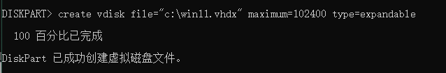 1 | create vdisk file="c:\win11.vhdx" maximum=102400 type=expandable |