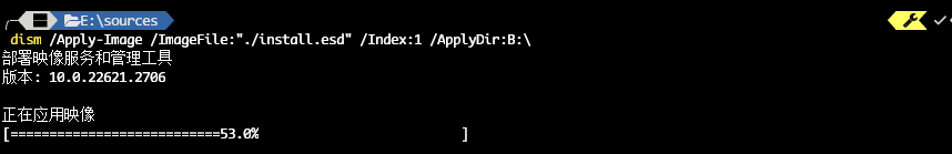 1 | dism /Apply-Image /ImageFile:"./install.esd" /Index:1 /ApplyDir:B:\ |