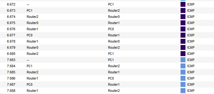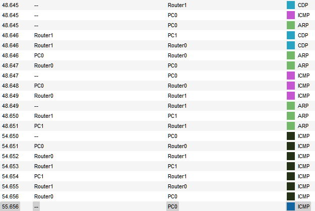 在测试pc0和pc1连通性时, 我注意到首次连接ICMP报文的第一个报文会丢失。重新打开拓扑使其初始化, 在simulate模式观察丢包的过程: