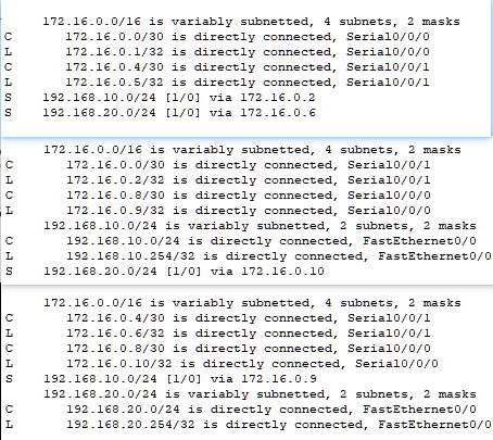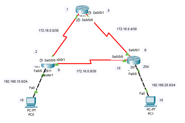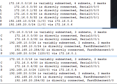实验二已完成, 不再重复。 关闭Router1的S0/0/0接口, 路由失效会自动切换到AD更大(优先级低)的可用的路由。
