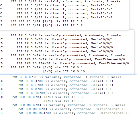 这样配置静态路由很麻烦, 需要添加很多条目, R7的配置比较容易, 两条静态路由即可, 一个接口入的丢给另一个接口;R5可以使用两条默认路由设置不同的AD; 可是R2已经有了通向ISP的默认路由, 通向右边的网段就要一个一个手动添加,会有很多条目,可以使用路由聚合。