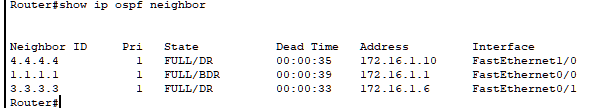可以看到宣告的网段上都成功运行了OSPF协议, 每个点对点网络上都完成了DR/BDR的选举, 状态为FULL。