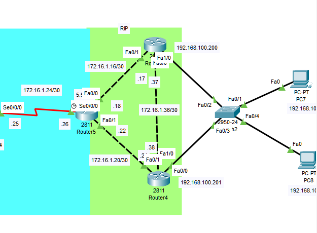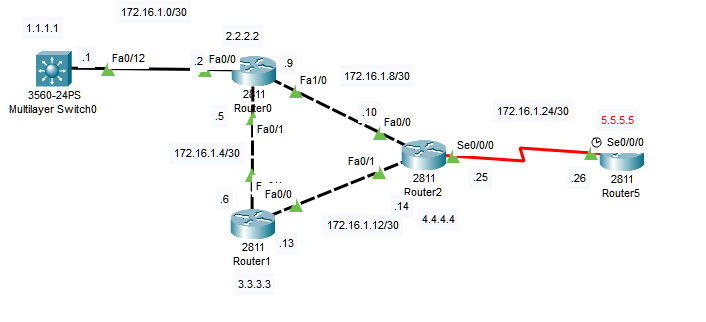 断开Router3-Router4的链路来使172.16.1.36/30网段失效,查看Router5的变化: