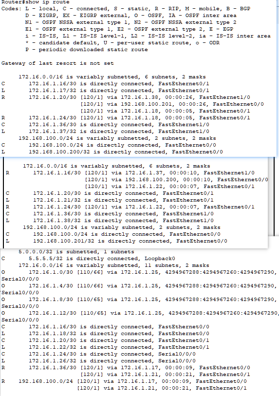 R5 路由表同时具有OSPF 和 RIP, 而左边OSPF区域只有OSPF路由, 右边RIP区域只有RIP路由条目, 两边主机不互通。