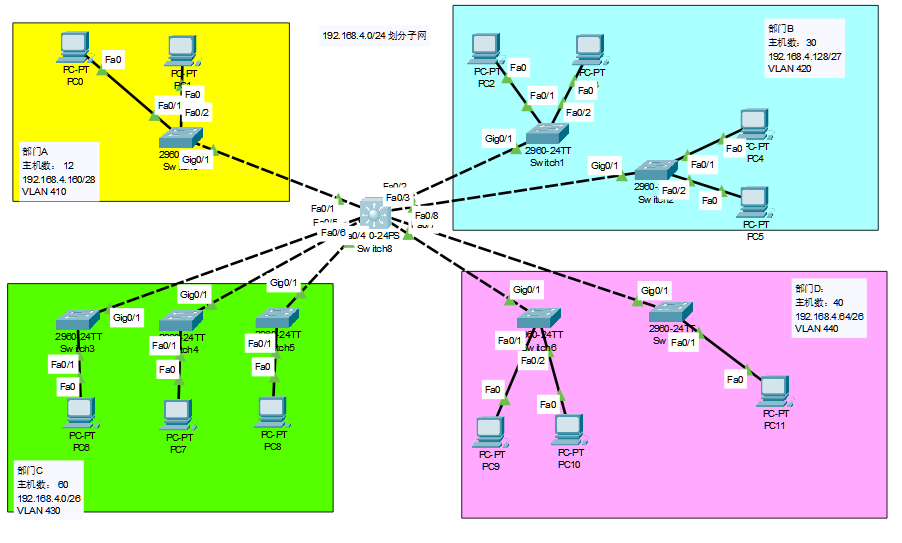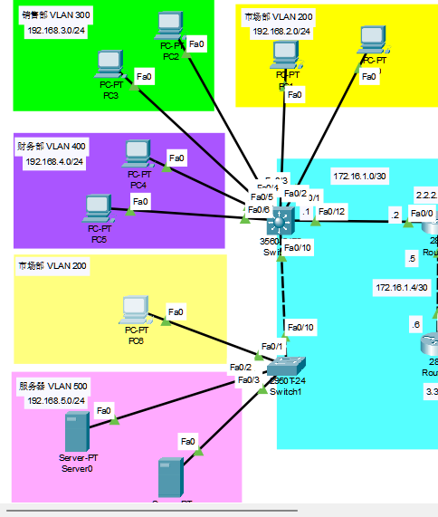 假设公司业务壮大,市场部扩容,需要对市场部进行子网划分,增加用户数量。