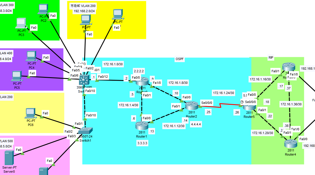 本次实验我完成了RIP的配置。 RIP一种基于距离矢量的IGP,支持的网络大小有限。通过路由器之间不断交换路由表从而达到路由收敛。需要注意的是, 无论是RIPv1 还是v2,宣告网络的时候需要填有类网络。 虽然v2已经支持了无类网络, 但只体现在交换路由的报文中,配置时需注意。