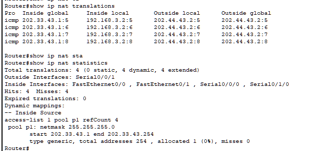 可以看到ICMP 报文在R2 通向ISP的出接口上完成了内部本地地址到内部全局地址的转换。值得注意的是, 这里给ICMP报文加了端口号。我们知道ICMP封装在IP内部,没有传输层端口号。 这里模拟器的实现方式是添加了顺序递增的端口号, 有点像PAT。